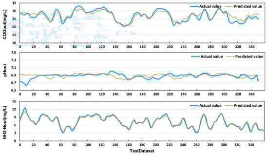 where  is the number of testing samples,  and  are the label vectors and model-predicted vectors, respectively, and  is the mean vector of the true values. , and  are vectors with three elements representing the MSE, MAE, and R2 values of the CODout, pHout, and NH3-Nout, respectively. The value ranges of Equations (12) and (13) are  ∈ [0, +∞) and  ∈ [0, 1], respectively. The smaller the MSE value, the closer the  is to 1 and the better the prediction performance that is achieved [].