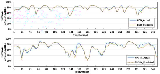 The prediction performance of the model was tested on the test set, and the predicted and the actual values are compared in Figure 6. It can be seen that the actual value curve is well approximated by the predicted value curve at the Δt of 9 h. From a quantitative perspective, the MSE and MAE values representing the prediction errors of the parameters of CODout, pHout, and NH3-Nout are [2.129, 0.006, 0.706] and [1.198, 0.054, 0.650], respectively, and the values of the three elements of R2 are [0.799, 0.490, 0.824]. The pH data remain in a small range of around 7, which makes it difficult for the model to learn the nonlinear mapping within the data, and it only learns to output a value very close to 7. The value range of CODout is the largest (20~34), and the maximum absolute error of prediction is only 2.45. The mean absolute percentage error (MAPE) of the model predictions for CODout, pHout and NH3-Nout are 4.6%, 0.8%, and 12.3%. It can be seen that the prediction accuracy of LMPNet meets the engineering requirements, and the prediction output of CODout, pHout, and NH3-Nout can effectively indicate a warning to the possible substandard of wastewater purification. The actual and predicted RE results are compared in Figure 7 to evaluate the efficiency of the proposed LMPNet model. The results showed that the curve fit of the RE is satisfactory due to the accurate prediction by LMPNet, which will be useful in the optimization of the automation and control of a WWTP.