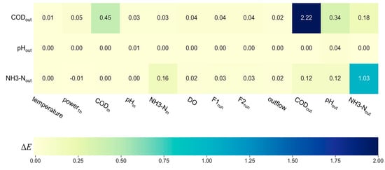 The chart of water quality characteristics in the ablation experiment. The Y-axis is the output features of the LMPNet model, and the X-axis is the input features that were deleted, respectively. The value in the graph is the increase in the output error () after ignoring the corresponding feature, and the larger the value indicates that the input feature is more important to the prediction of the output feature.