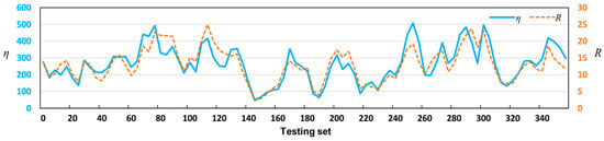 where T = t/4, t ∈ [0, 359], and  is the power consumption per hour. The purification efficiency is averaged over 4 h because this is the maximum predictable period for the LMPNet. Figure 9 shows the purification efficiency factor η and the synthesized purification factor R over the hours of the testing set.