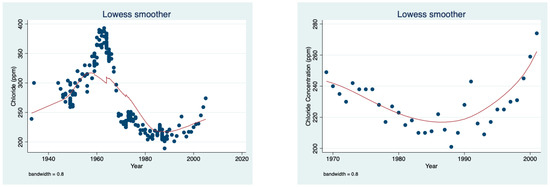 Trend of changes (Lowess smoother, 0.8 bandwidth) of annual lake average of chloride concentration (ppm). Two periods are presented: Left—1934–2005 and Right—1969–2001.
