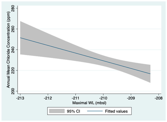 Linear prediction (95% CI) of annual mean of Lake Kinneret’s chloride concentration (ppm) relative to the annual mean of Lake Kinneret’s WL altitude (mbsl) (1969–2018).