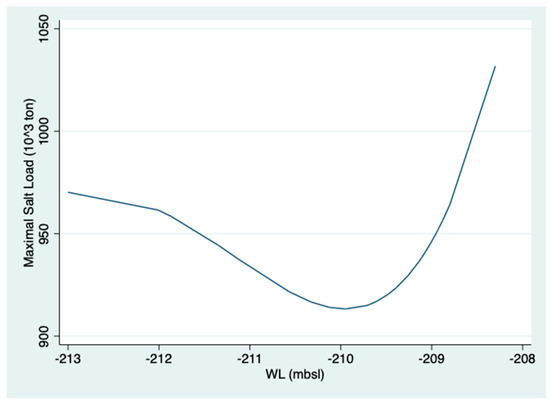 Fractional polynomial regression between annual (1969–2018) maximal salt load (103 ton/lake) and annual mean of WL. Salt load is based on chloride concentration (ppm) and maximal lake volume (106 m3/year; mcm/y), which is respective to WL altitude as published in the morphometric map of Lake Kinneret by TAHAL in 1961 [1].