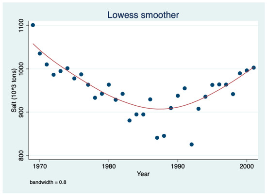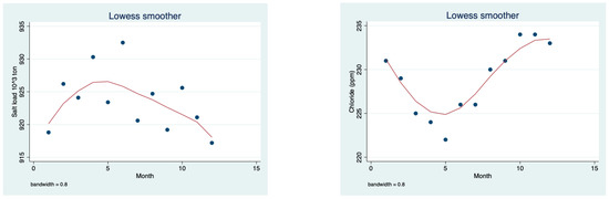 Lowess smoother (0.8 bandwidth) trend of changes plot of monthly changes of chloride concentration (ppm) (left) and salt loads (103 tons) (right) (1969–2001).