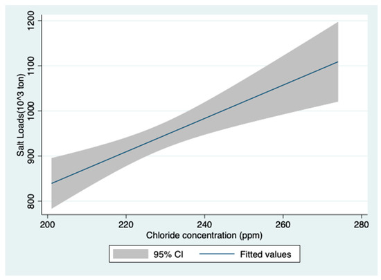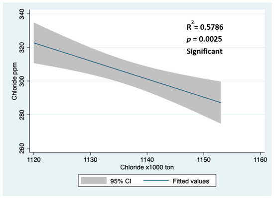 Linear regression (95% Cl) (r2 and p values are given) between monthly means of chloride concentration (ppm) and salt load (103 tons) during the hydraulic year (October to next September), 2018–2019 (Data Source: Mekorot National Water Supply Co., Jordan districts, Laboratory and Drainage Basin Unit).