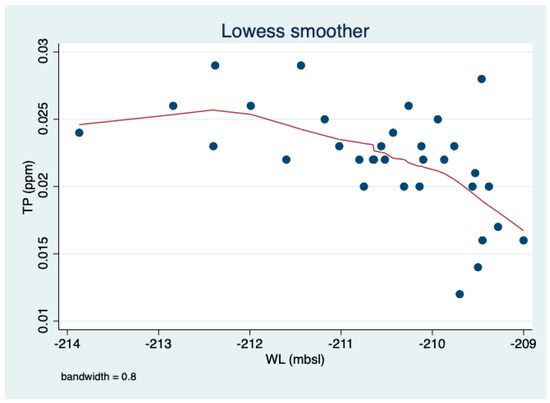 Trend of changes (Lowess smoother, 0.8 bandwidth) of annual lake averages of TP concentration (ppm scale range: 0.01–0.03) vs. WL (mbsl) during 1969–2001.