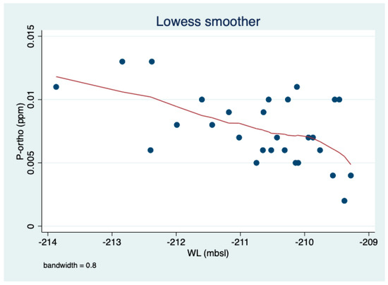 The decline of orthophosphate concentration with respect to increased WL altitudes from 214 to 209 mbsl is clearly indicated in Figure 9.