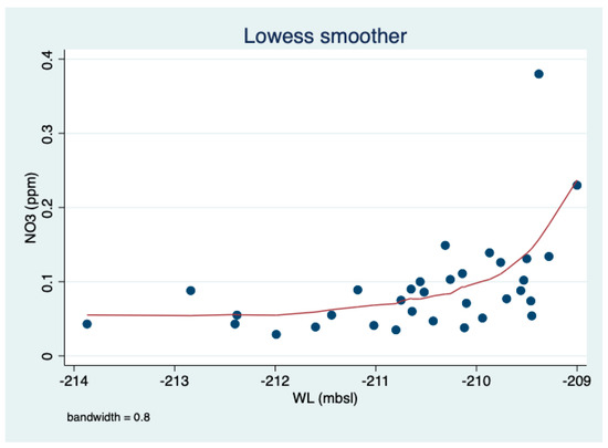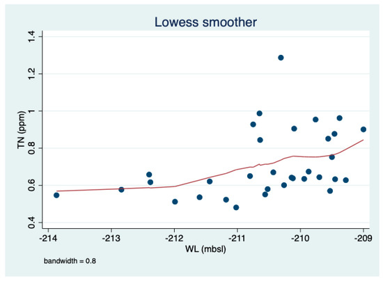 The increase of TN and NO3 concentration respective to WL elevation is documented in Figure 10 and Figure 11. The prominent increase occurs at the WL range between 211–209 mbsl, though the relation between the upper range of WL (211–209 mbsl) is a result of the enhancement of the Jordan River’s discharge.