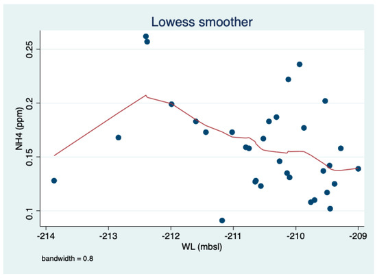 Trend of changes (Lowess smoother, 0.8 bandwidth) of annual lake averages of ammonium concentration (ppm scale range: 0.1–0.25) vs. WL (mbsl) during 1969–2001.