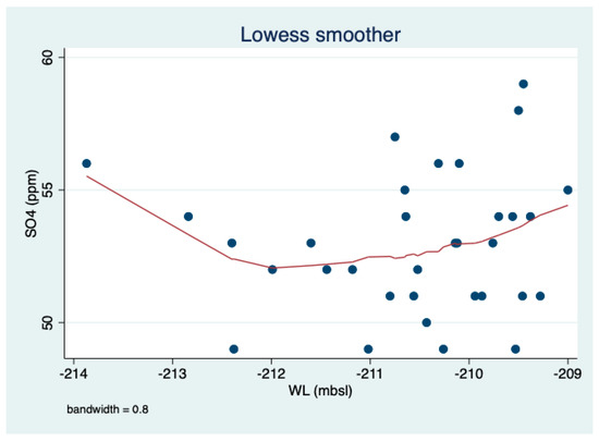 Trend of changes (Lowess smoother, 0.8 bandwidth) of annual lake averages of sulfate (SO4) concentration (ppm) vs. WL (mbsl) during 1969–2001.