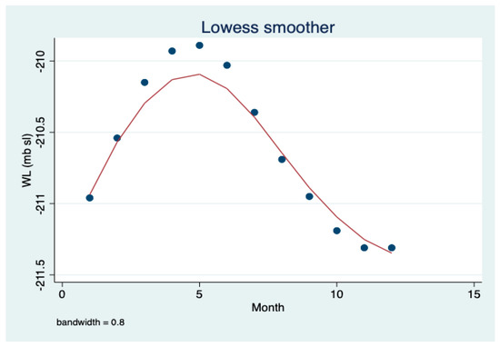 Lowess smoother (0.8 bandwidth) trend of changes plot of monthly changes of WL (mbsl) (1969–2001).