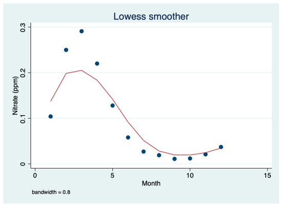 Lowess smoother (0.8 bandwidth) trend of changes plot of monthly changes of nitrate concentrations (ppm scale range: 0.0–0.3) (1969–2001).