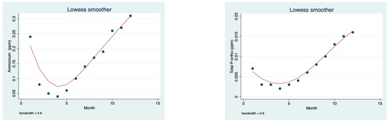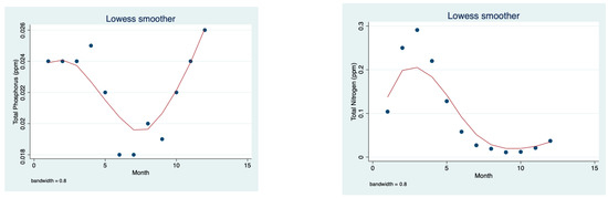 Lowess smoother (0.8 bandwidth) trend of changes plot of monthly changes of total phosphorus (left) and total nitrogen (right) concentrations (ppm scale range: Total Phosphorus—0.018–0.026; Total Nitrogen—0.0–0.3) (1969–2001).