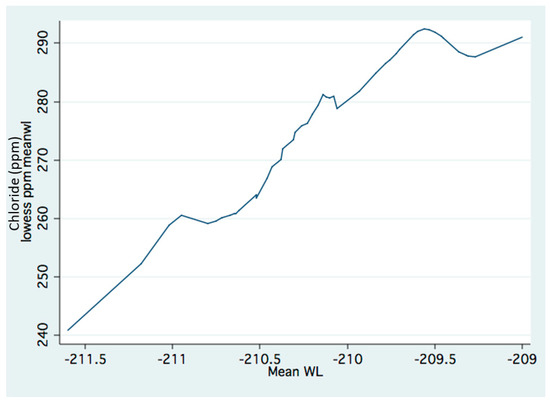 Trend of changes (LOWESS 0.8 bandwidth) of mean annual concentration of chloride (ppm) in relation to annual mean of WL in Lake Kinneret during 1933–1969.
