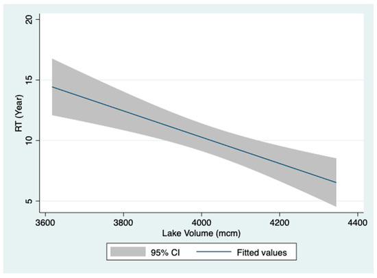 Linear regression (95% CI) between annual means (1970–2020) of Hydraulic residence time (HRT) (Years) and lake volume (mcm).