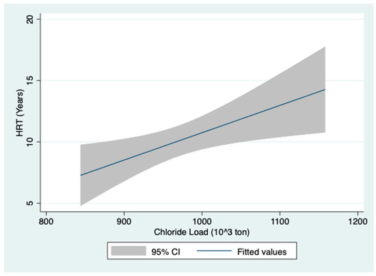 Linear regression (95% CI) between annual means (1970–2020) of Hydraulic residence time (HRT) (Years) and salt load (103 tons).