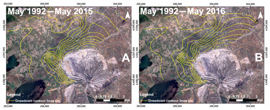 Equal drawdown contour lines between: (A) May 1992–May 2015 and (B) May 1992–May 2016.