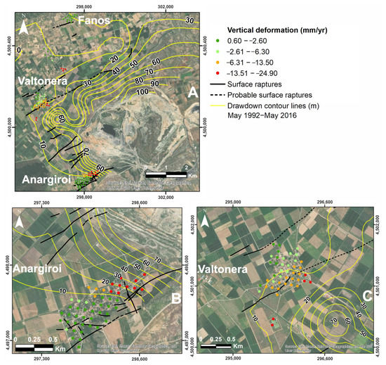 (A) Vertical deformations (mm/year) between 5 January 2016 and 31 December 2020 according to the InSAR data provided by Copernicus Land Monitoring Service [26] along with the recorded surfaces ruptures and the drawdown contour lines. (B,C) scale up view of the Anargiroi and Valtonera villages.