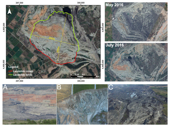 The spatial extent of the 10 June 2017 landslide at the Amyntaio mine, as shown by satellite imagery. Images obtained by Google Earth. (A–C) show oblique views of the landslide area. (A) one of the bucket wheel excavators buried inside the sliding mass; (B) panoramic view of the landslide scarp in front of the Anargyroi village; and (C) panoramic view of the landslide head looking towards East West.