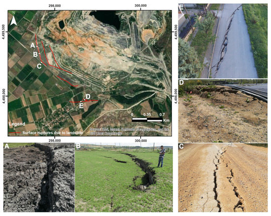 Spatial distribution of surface ruptures identified behind the crown of the 10 June 2017 landslide. (A,B) surface ruptures within the basin between Anargiroi and Valtonera village (the height of the scarp is approximately 1 m), (C,D) pre-existing surface ruptures caused by the land subsidence phenomenon that were intensified by the landslide event in the NW part of Anargiroi village, and (E) damage along the Anargyroi village road network.