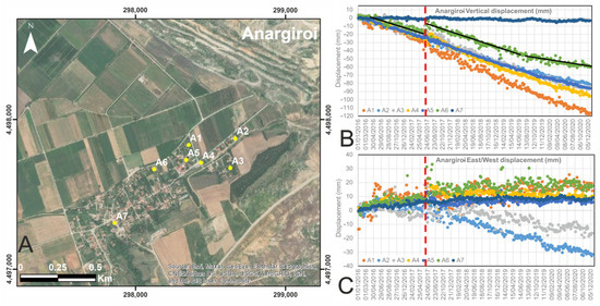 Spatial distribution of examined PS points (A) along with their displacement time series (B,C) at the village of Anargiroi. The dashed red line indicates the date of the mining landslide event. The trend lines added to the time series of point A6 indicate the variations of the land subsiding trend due to the draining activities before and after the occurrence of the landslide, as well as after the 2016 cessation of pumping from the wells located between the village and the open pit. Point A6 was selected as it clearly presents the disturbance caused by the landslide as well as the slight reduction of the deformations after the end of the end of the draining activities.