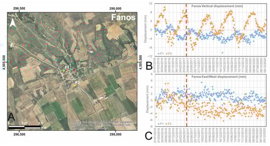 Spatial distribution of examined PS points (A) along with their displacement time series (B,C) at the village of Fanos. The dashed line indicates the date of the mining landslide event. The points were selected from both sides of the fault crossing the village, pointing to the displacements taking place on the stiff Neogene, point F1, and the soft Quaternary, point F2, formations.