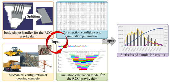 With the rapid development of computer and simulation technology, simulation has become the primary means of studying construction progress, by adopting computers to simulate the dynamic process of concrete dam construction. The application of computer simulation technology in concrete project construction began in the early 1970s. Jurencha and Widmann proposed a concrete pouring process simulation in combination with concrete gravity dam construction, which was applied to the construction of the Schlegeis dam in Austria [7]. For over four decades, many scholars have developed theoretical methods and application research on simulation of the construction process. Those can be divided into four phases. For the first stage, Halpin proposed the cycle operation network (CYCLONE) construction simulation method for repetitive projects [8]. Many studies in this period are to expand and improve the CYCLONE, including Insight [9], UM-CYCLONE [10], STEPS [11], and HK-CONSIM [12]. In the second phase, construction simulation technology is characterized by objected-oriented simulation [13]. Simulation system users can build models, allocate resources, and connect with other scheduling systems through a graphical interface, which reduces coding and enhances model readability [14,15]. The third stage is the combination of the construction simulation and visualization technologies [16,17]. Kamat and Martinez developed Vitascope, a discrete construction simulation platform that integrates 3D visualization capabilities [18]. Lu and Olofsson proposed a BIM–DES framework, which implies changes in the building information modeling process [19]. Zhang et al. [20] designed loose-coupling visualization components in a distributed construction simulation environment with HLA. In recent years, integrating the artificial intelligence, big data, cloud computing, and other new information technologies, the intelligent construction simulation for the construction stage has developed rapidly [21]. The intelligent simulation is based on automatic perception, automatic simulation [22], multidimensional coupling, multiparty collaboration, and real-time feedback [23] as the basic mode to establish an intelligent progress analysis and control system that has the functions of perception, analysis, and control [24]. In general, for the design stage, the construction simulation technology has matured, but that of the construction stage is the current research hotspot.
