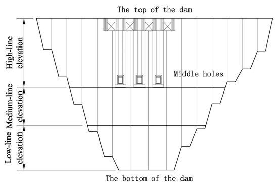 (1) In the mechanical configuration of pouring concrete, the arch dam construction generally adopts cables to pour dam blocks, and rarely involves other pouring machinery. However, the RCC gravity dam construction involves many types of pouring machinery, and different types of pouring machinery are used on different elevations and dam monoliths. The commonly used pouring machinery includes belt conveyors, dump trucks, chutes, tower (belt) machines, cable cranes, and others. The initial conditions of the simulation system need to give the mechanical configuration and its coverage. According to engineering experience, the low-line concrete of the dam body is often transported and placed by dump trucks. The medium- and high-line concrete is transported and placed with the cooperation of a variety of machinery. The high-, middle-, and low-lines of the dam body are divided according to the following (see Figure 5):