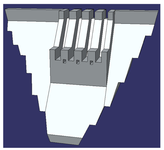 Figure 6 is the three-dimensional model of the Y2 arch dam. The dam is a concrete hyperbolic arch dam, and its concrete volume is 1.51 × 106 m3 with 17 dam monoliths. The dam body has 4 discharge surface holes, 3 middle holes, and 1 diversion bottom hole.