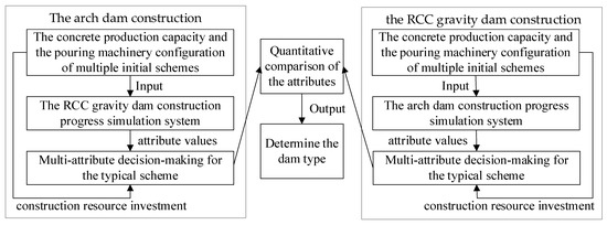 Based on the above analysis, a comparison method of the dam type selection between the arch dam and the RCC gravity dam is proposed, which is shown in Figure 8. First, several initial construction schemes are designed for a dam type, which are the input of the simulation system. Then, the simulation system can calculate the attribute value of each construction scheme. Secondly, based on these attribute values and the construction resource investment of each scheme, a multiattribute decision is used to select the typical schemes for each dam type [27]. Finally, the dam type selection is made by comparing progress attributes of the typical schemes of arch dam and gravity dam.