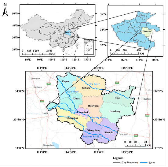 Zhoukou is located in the East Henan Plain in the southeast of Henan Province. The location map of Zhoukou City is shown in Figure 1. Its geographical coordinates are 33°03′–34°20′ north latitude, 114°05′–115°39′ east longitude, 135 km wide from north to south and 140 km long from east to west. Zhoukou’s central city area is south of the Ningluo Expressway, east to the Dagang Expressway, and northwest to the Shangzhou Expressway—the actual area enclosed by three expressways, with a total area of about 271 km2. The area is under the jurisdiction of Qililu Road Office, Hehua Road Office, Chenzhou Street Hui Office, Renhe Office, Xiaoqiao Office, Taihao Road Office, Li Bukou Township, Xuwan Township, Jinhai Road Office, Huaihe Road Office, Chengnan Office, Chengbei Office, and Movingkou Office. The current urban construction land area is about 70 km2; the rest is mainly agricultural land and village construction land.