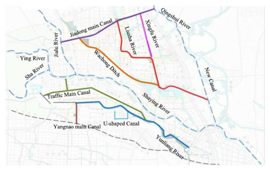 The main stormwater receiving water bodies in the central city of Zhoukou are the Wachong Ditch, Jialu River, Shaying River, the Jiaoying River, the Traffic Main Canal, the Qingshui River, the Yangnao Main Canal, the North–South Main Canal, the Yongfeng Main Canal, the U-shaped Canal and the Yunliang River, among more than ten other rivers and canal. Rainwater discharge in the central city of Zhoukou mainly relies on facilities such as roadside covered drains or concealed pipes and culverts buried under roads to collect and convey rainwater, which is then discharged into the rivers and canals in the city, which eventually merge into the Wachong Canal, the Happiness River, the Yunliang River, the Jiadong Main Canal and the Qingshui River, before being discharged into the Shaying River. See Figure 3 for the river system.