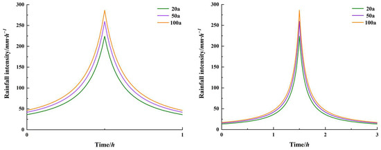According to the above method to derive the 20-year rainfall for 1 h and 3 h epochs, the peak rainfall is 223.95 mm/h, and the total precipitation is 82.37 mm and 123.97 mm, respectively; there is 50-year rainfall lasting 1 h and 3 h, with peak rainfall of 259.47 mm/h and total precipitation of 95.44 mm and 143.64 mm, respectively. The 100-year rainfall lasted for 1 h and 3 h, the peak rainfall was 286.344 mm/h, and the total precipitation was 105.32 mm and 158.51 mm, respectively. The design rainfall is shown in Figure 4.