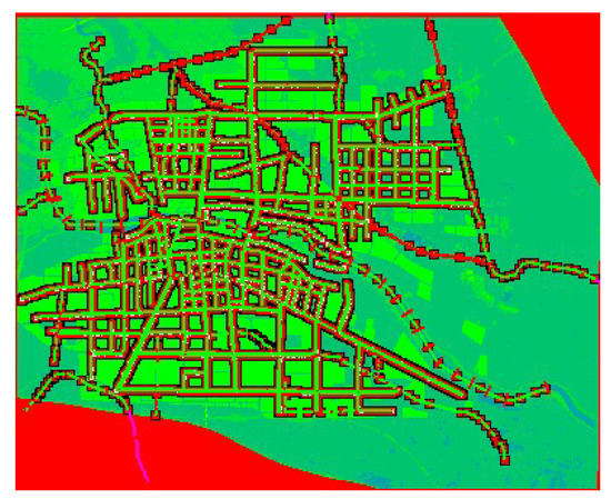 The analysis of the current situation of Zhoukou city in the urban built-up area shows that the proportion of hardening of the lower mat surface is high, and the indicators for green areas and squares are obviously low, accounting for about 4% of the total urban land, with less than 5 m2 per capita, which is far below the indicator of 10 m2 per capita. The current situation of Zhoukou city’s central urban area is shown in Figure 2.