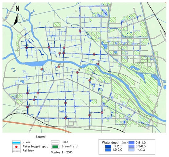 This paper takes the period of 20 July 2021 in Zhoukou City as an example, choosing 20 major waterlogging points in the central city, and the distribution of waterlogging points is shown in Figure 6. The measured maximum ponding depth data were compared with the maximum ponding depth simulated by the numerical model, as shown in Table 2.
