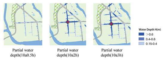 For example, near the intersection of Yinzhu Road and Construction Road, precipitation in the area is discharged to the Jalu River via a stormwater pipe via the Dongfengdi drainage pumping station. There is gradual waterlogging when the once-in-a-decade rainfall lasts for more than two hours. See Figure 7 for a map of the water depth at this condition. The diameter of the rainwater pipes in the area is 600–800 mm. There is maximum power of 3.78 m3/s at the current state of the Dongfengdi drainage pumping station. It can be seen that the main reason for the water on the roads when the pumping station is not operating at full power is that some of the catchment network pipe diameters do not meet the actual drainage of the urban area.