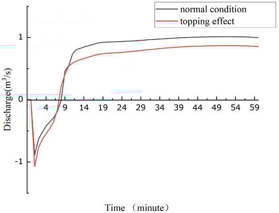 In this case, the water level of the river in Wachong Ditch rises and the drainage outlet of the Wachong Ditch pipe is subjected to a topping effect, which significantly reduces the drainage capacity by approximately 0.4 m3/s. With the increase in time and intensity of the storm, the outlet flow capacity gradually decreases.