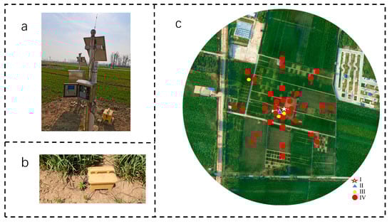 Location of the cosmic-ray neutron sensing probe and the experimental sampling design at Fengqiu station. (a) Cosmic-ray neutron sensing probe. (b) Frequency domain reflection (FDR) auto soil moisture monitor. (c) Bird’s-eye view of the study site, I: cosmic-ray neutron sensing probe; II: meteorological instrument; III: FDR auto soil moisture monitors; IV: soil sampling points.