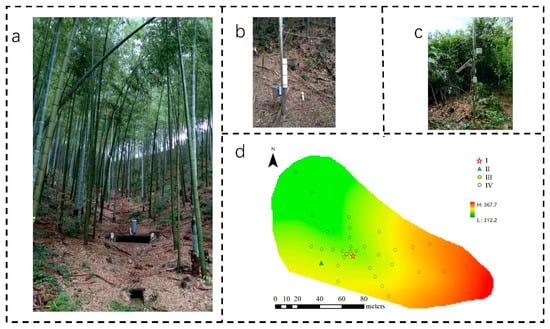 Location of the cosmic-ray neutron sensing probe and the experimental sampling design at Hemuqiao station. (a) View of the study site. (b) CRNP system. (c) Meteorological instrument. (d) Digital elevation map and sampling points of the study site, I: CRNP; II: Meteorological instrument; III: FDR auto soil moisture monitor; IV: Soil sampling points.