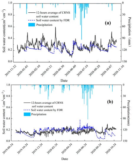 The time series of daily precipitation during the study period is also shown in Figure 3. Distinct seasonality in precipitation was observed at both study sites due to the monsoon climate. The total precipitation during the study period for Fengqiu and Hemuqiao was 647.4 mm and 1155.2 mm, respectively. The rare precipitation and higher SWC of Fengqiu also indicated that farmland has a higher capacity to store water than mountainous regions. Transient changes in SWC generated by precipitation were sensitively observed by CRNS at the Fengqiu station (see Figure 3a). The CRNS accurately captured each precipitation event, although some precipitation events did not have a significant effect on the SWC. The response characteristics to precipitation indicated that CRNS was more sensitive to changes in SWC than other soil-mounted detectors [,].