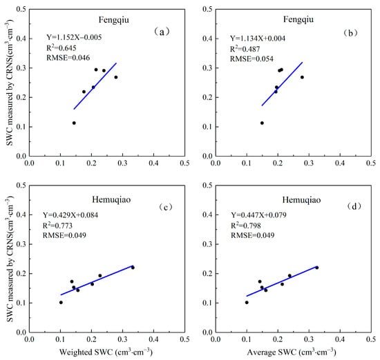 The SWC correlation between CRNS and point sampling. (a) The SWC correlation between CRNS and weighted point sampling in Fengqiu. (b) The SWC correlation between CRNS and averaged point sampling in Fengqiu. (c) The SWC correlation between CRNS and weighted point sampling in Hemuqiao. (d) The SWC correlation between CRNS and averaged point sampling in Hemuqiao.
