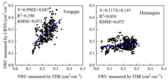 Comparison of SWC measured by the CRNS and the FDR at the Fengqiu station (a) and the Hemuqiao station (b). N0 corresponds to the neutron count rate on 4 June 2020, at the Fengqiu station, while N0 corresponds to the neutron count rate on 18 November 2019, at the Hemuqiao station.