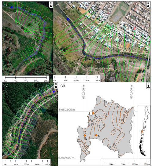 Orthophoto of the (a) Bellavista (Lat/Lon: 36°38′51″ S, 72°56′41″ W), (b) Curanilahue (Lat/Lon: 37°29′35″ S, 73°19′21″ W), and (c) Nicodahue (Lat/Lon: 37°29′13″ S, 72°46′25″ W) rivers and (d) their locations in Chile, with a map of rainfall isohyets in mm. The green lines indicate the cross sections of the modeling domain and the blue lines indicate the flow directions of the rivers. Coordinates UTM 18S (WGS 84).