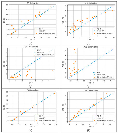 It is observed that in the Bellavista and Nicodahue rivers, the increase in W/D-RS is maintained in the order and distribution of the W/D-T results. In the Nicodahue River, because the floodplain is contained in the valley, the mean variations of W/D and ER are 0.3 and 0.03 m/m, respectively. In Bellavista, W/D-RS increases 2.6 m/m due to the increase in the floodplain area, as does ER-RS, which increases 0.16 m/m on average.