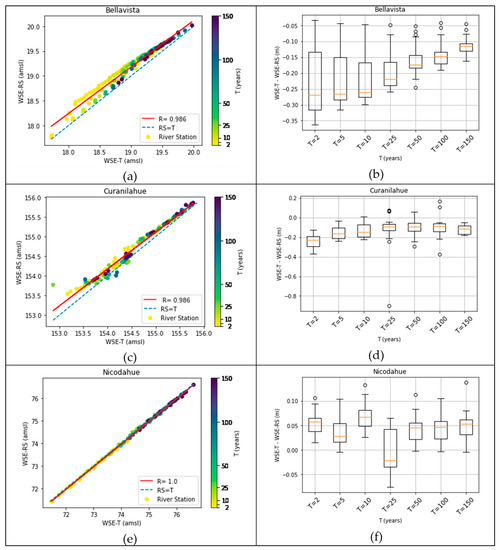In addition, the decrease in WSE errors is due to the increase in flood width, which compensates for the lack of bathymetric data in the active flood plain using UAVs. Errors are observed to be stable in Nicodahue due to the shallow depth of its initial conditions for the creation of the DTM-RS, the behavior of which at low flows is similar to that at high flows, explained by its degree of lateral confinement. In the Curanilahue river, a slight change in WSE differences trend is observed for the T = 150 years (i.e., the absolute value of the median tends to increase with T, but for T = 150 years, it slightly increases; Figure 4d). This behavior is caused by two cross sections where the HM-RS floods, but the HM-T does not.