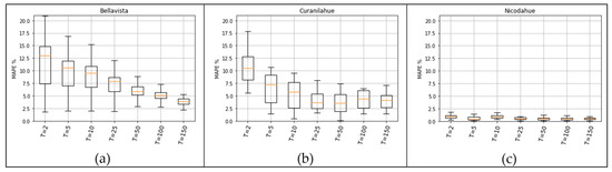 Figure 5 shows, via boxplots, the error percentage variation at different return periods for the Bellavista, Curanilahue, and Nicodahue rivers.