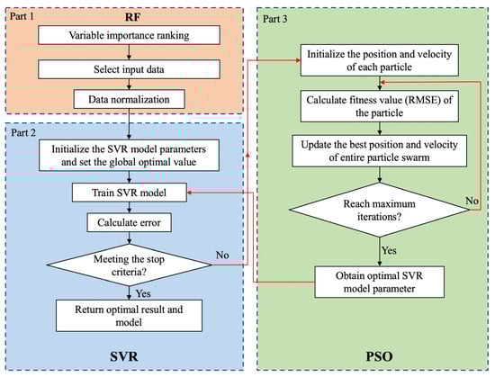 The hybrid model combines random forest, support vector regression and particle swarm optimization algorithms. The hybrid model consists of three parts, the first part involves data selection and pre-processing, in which variable importance is ranked using the random forest method. Subsequently, input data for the SVR model are selected based on variable importance. To enhance computational efficiency, convergence accuracy and estimation precision, it was necessary to normalize the input variables of the model due to their different dimensions. This was achieved by normalizing the variables according to Equation (11).