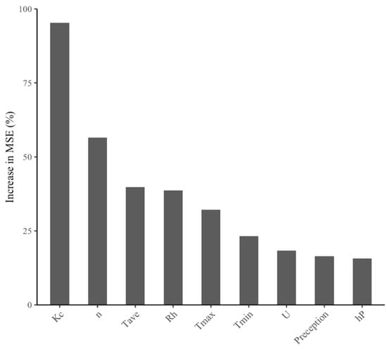 To identify the principal variables affecting ETc, we fitted the model using all nine variables, including eight meteorological variables and Kc, based on RF analysis. The ranking of importance of the variables showed that Kc had the greatest impact on ETc, reaching 95.23%, followed by n, Tave, RH, Tmax, Tmin, U, hP and Precipitation (Figure 2). This result shows that the most important factors affecting ETc, in addition to crop coefficients, are sunshine hours, temperature, and relative humidity, which is similar to what was found in the study conducted by Pinos, Chacón and Feyen []. Therefore, we added Kc to all machine learning models. We then added the three, four and five variables with the highest importance outside of Kc as input variables to the machine learning model.