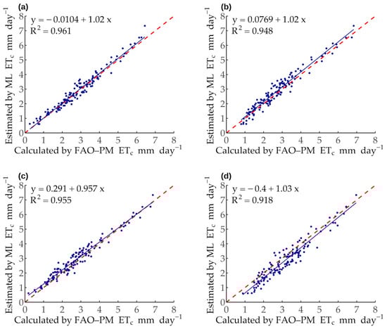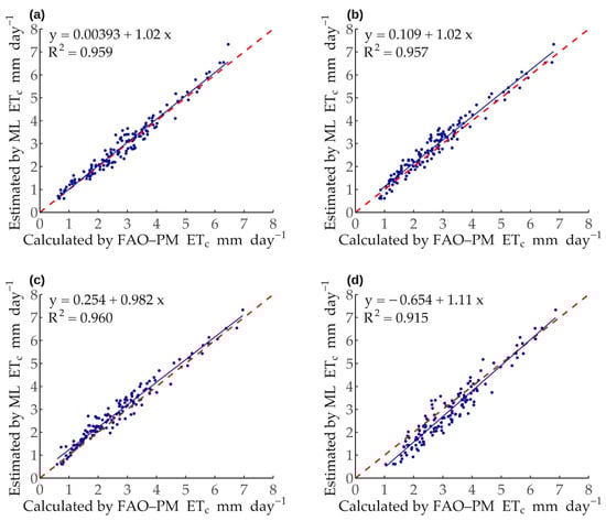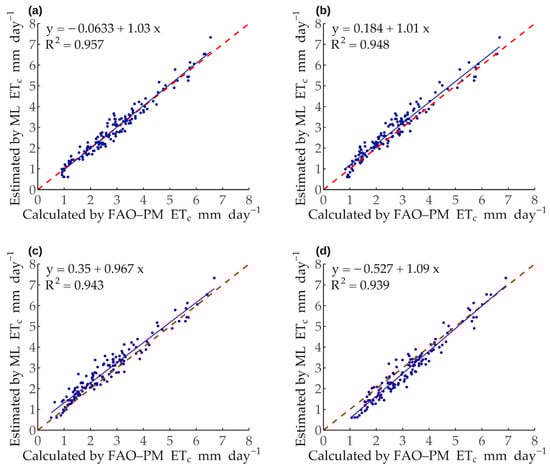 Scatter plots of calculated daily spring maize ETc values by FAO–PM method compared with ML model-estimated values with Kc, Tave, Tmax, Tmin, n and RH as the input. RF–SVR–PSO model (a), SVR model (b), BPNN model (c) and RF model (d).