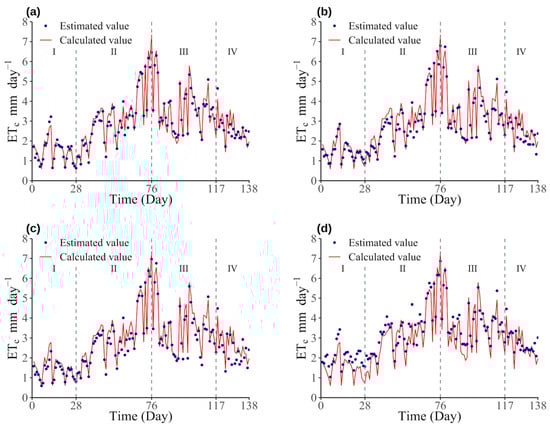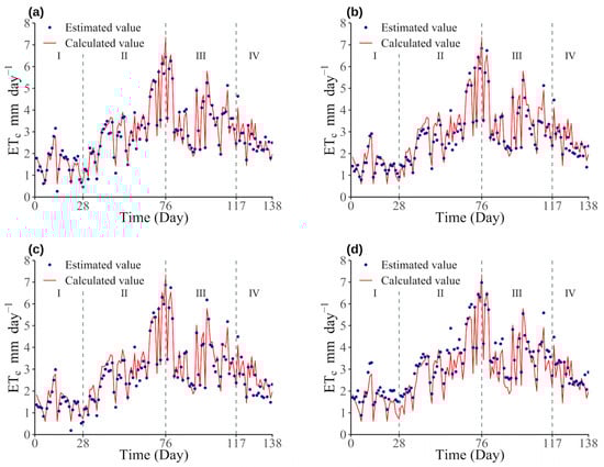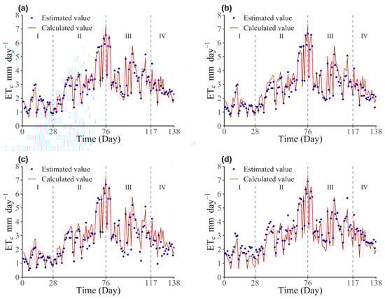 Comparison of simulated and calculated values of spring maize ETc in 2019 of different models with Kc, Tave, Tmax, n and RH as the input: RF–SVR–PSO model (a), SVR model (b), BPNN model (c) and RF model (d). The areas labeled I, II, III and IV indicate the initial stage, crop development stage, mid-season stage and late-season stage, respectively.